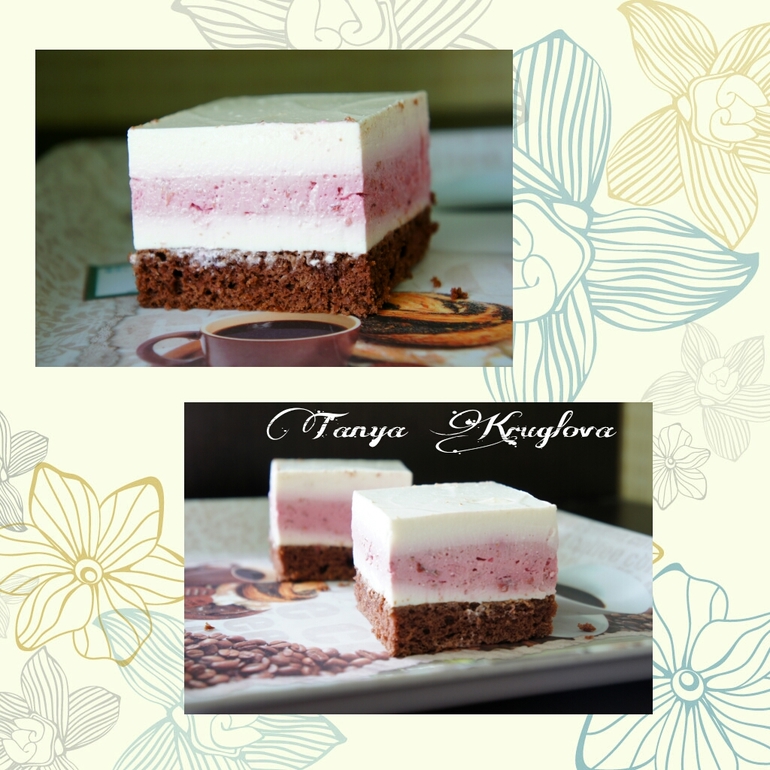 Здесь у меня творог, сметана, сахар и желатин. Средний слой с добавлением перетертой в блендере вишни. Низушка бисквитная (типа шоб масла меньше было)))