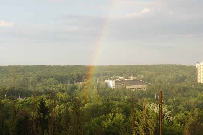 Откопала фотку. Как мне нравится это явление природы! Оно волшебное, необычное и радостное. Оно когда идет дождь и светит сонце одновременно. Она всегда появляется у нас над лесом)