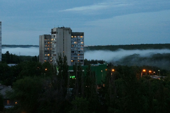 Такая красотень у нас бывает после дождя. Туман плотной белой пеной лежит над деревьями, как будто облако упало