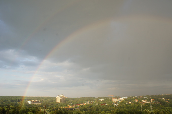 Дождь идет, светит солнце... и радуга! Вот это мостик! И всегда двойная - одно коромысло, яркое, а над ним еще, побледнее. И так интересно наблюдать, откуда она вырастает, прямо место это видно)))