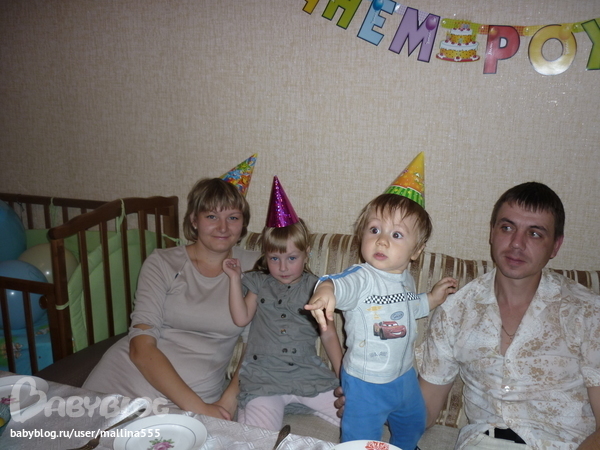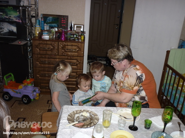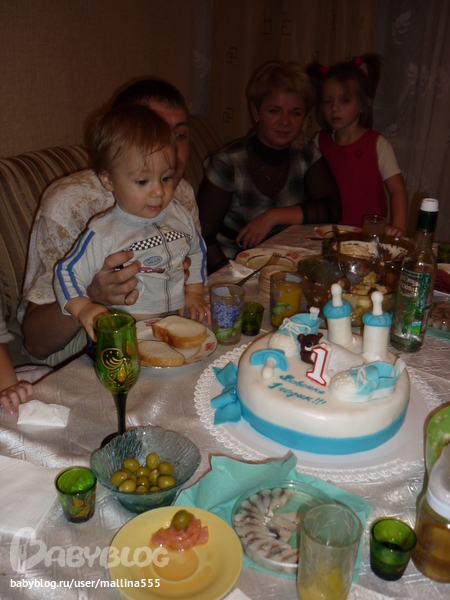 На праздник позвали только близких(крестных с семьями и детьми, и подругу с дочкой, и еще моя мамочка из Таганрога приехала). Надули много шариков, повесили гирлянду на стену. На радостях именник спер со стола сырокопченую колбасу, ну мы в честь праздника не стали забирать, так он полчаса смаковал этоткусочек с довольно хитрой моськой)))) Было еще трое детей, так что Вовчик повеселился от души! настоящий детский день рождения! (заснул потом вмиг и спал без пробуждений аж до 7.30 утра!!!)