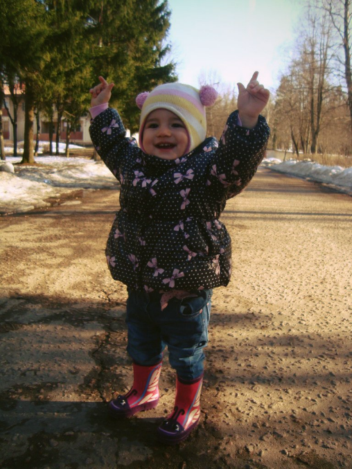 С детками днем мы гуляем в синтепоновых штанах,им по 2 с лишним года всем и они играют в лужах,приходится штаны непромокаемые надевать,она за ними лезет))А дорога тут одна,ее раскатали,целый день машины ездят,а вокруг лес)