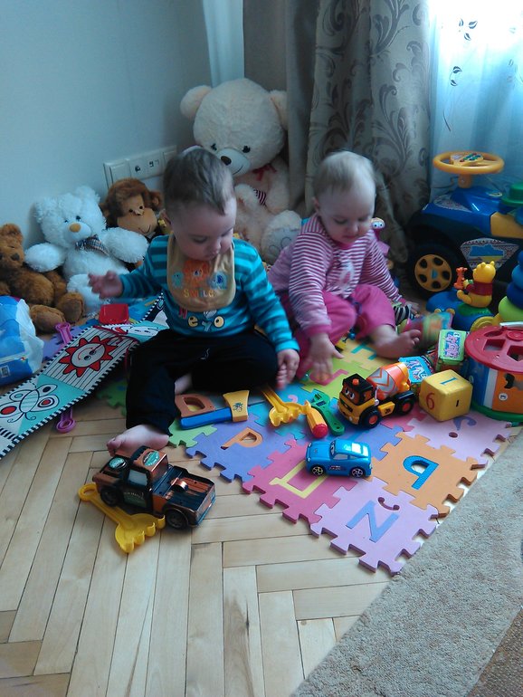 Кушаем хорошо,спим раз в день 2 часа,играют всем кроме нормальных детских игрух) Со словами туго...ничего почти не говорят,может слов 5,а так все понимают,показывают...ну ничего думаю все со временем)