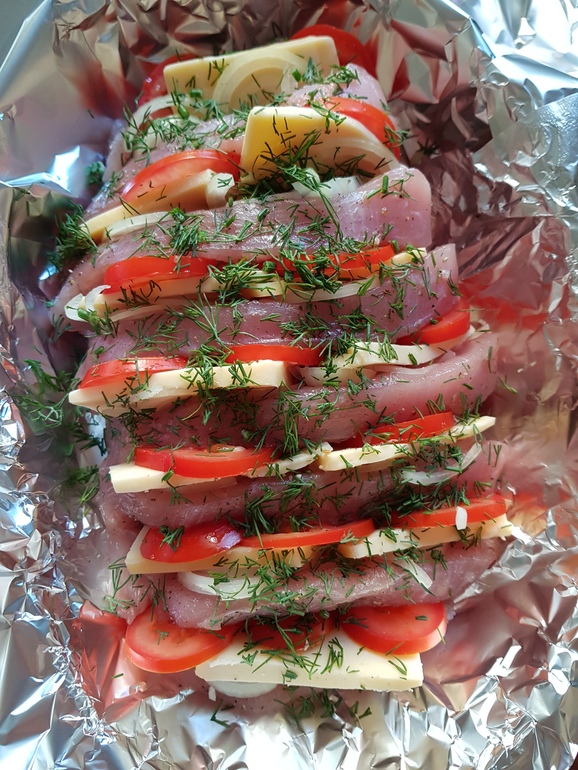 Мясо моем и обсушим. Нарежем, но не до конца, на ломтики, толщиной примерно 1,5 см. Солим и перчим мясо. Можно посыпать сухими ароматными травами - прованскими, базиликом, розмарином.