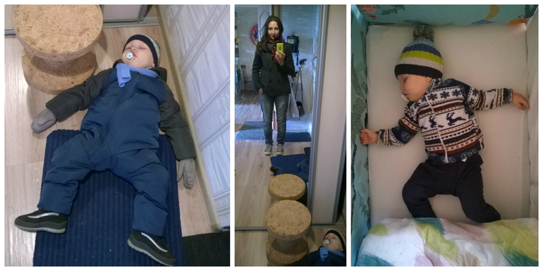 5. Тут приключился конфуз. Запустила я ребенка в квартиру, и пока парковала коляску в подъезде он вырубился. Вот так без обеда. Ну я же инстамама все дела, пофоткаться на фоне-необходимость. Аккуратненько переношу. На сноубордиста похож если воображение подключить :)