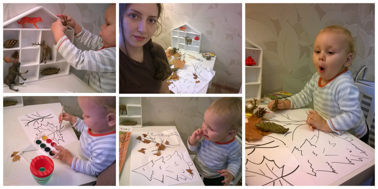9. По возвращению немного занятий. Как всегда притащили листья и шишки. у нас уже целая коробка с лесом :)