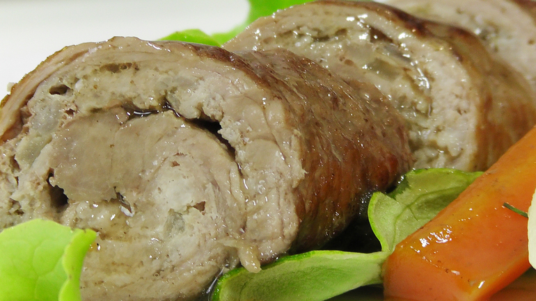 Говядину нарезать ломтиками толщиной 1 см. отбить. Свинину пропустить через мясорубку, добавить толченый чеснок, рубленый лук, соль, перец. Каждый ломтик говядины равномерно обмазать фаршем, скатать рулетиком, перевязать белой ниткой и обжарить в масле.