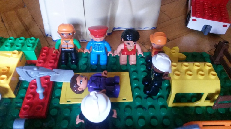 Ребенок сделал из конструктора такую вот композицию. Девочка лежит на прямоугольнике, рядом лопата и люди вокруг. Моя первая мысль - кладбище, похороны Ну думаю все, докатились!