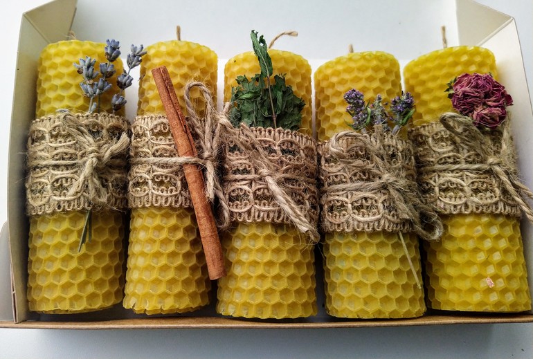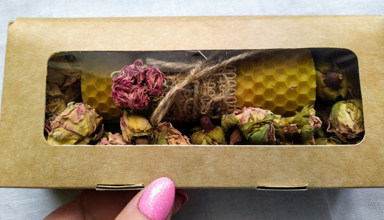 Свечи ручной работы из натуральной вощины с эфирными маслами, измельченными травами внутри и цельными снаружи.