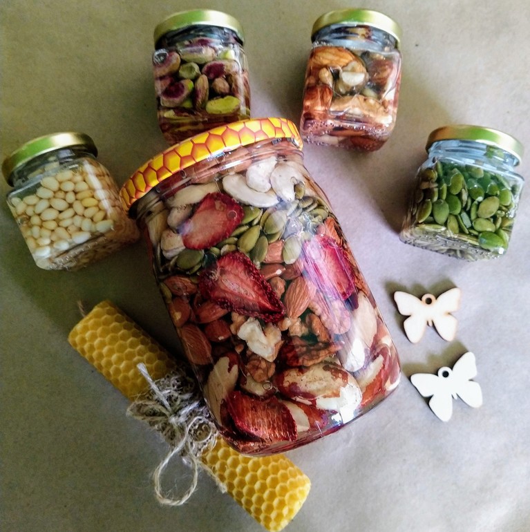 Это выглядит как уже готовый подарок! Лучше всяких конфет😍Натуральный домашний мед из белой акации* , сушеная клубника и много, оооочень много орешков!!!