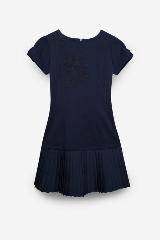 Платье синего цвета с короткими рукавами. На груди модель декорирована цветочным орнаментом. Низ юбки выполнен в мелкую складку.128 размер,новое. 3000р