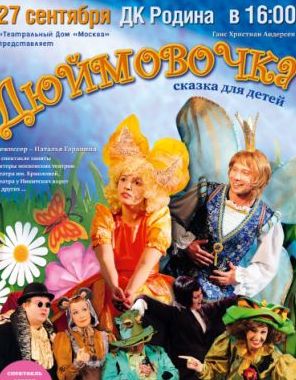 Вчера ходили в ДК "Родина" на "Дюймовочку" , купили билеты по 700 рублей на 1 ряд, брали почти за месяц и очень ждали. Я думала, что за такие деньги будет что-то приличное, ан нет)) А мне -то расписали)) Так вот, неладное я почувствовала, когда вошла в зал: на 1 ряду мало что видно, тк сцена расположена очень высоко! Ребенок сидел почти весь спектакль у меня на коленках, но все равно, как из ямы смотришь, да и многих напольных декораций из-за этого не видно (маленькие пеньки и тд.).