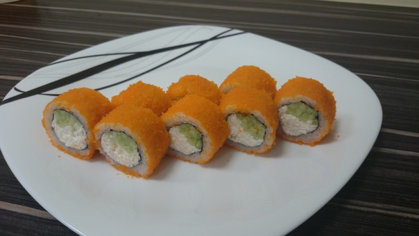 Калифорния лайт - рис,нори,снежный краб,майонез или сливочный сыр,огурец,икра масага