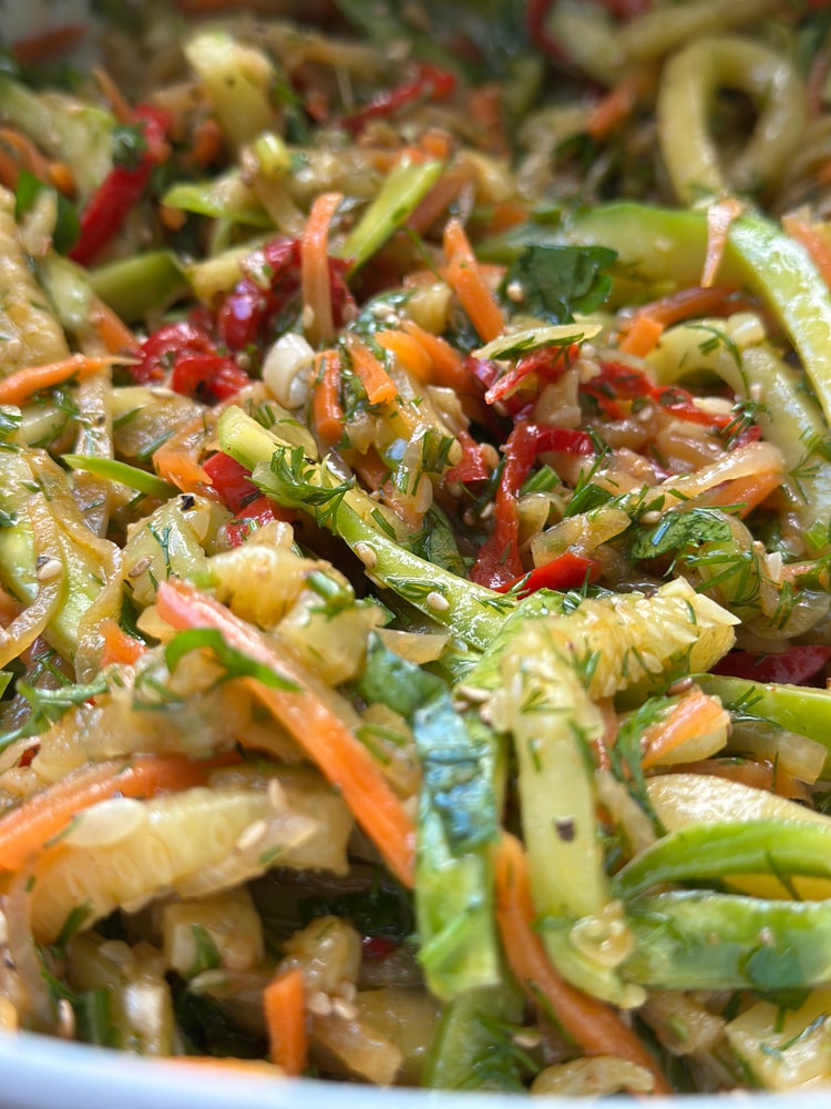 Кабачки очень хорошо отжала от воды. Всё делаю в перчатках. В большой миске соединила зажарку и кабачки отжатые. Туда же две чайные ложки сахара, чайная ложка кориандра, полчайной ложки черного перца, приправы умами примерно ч ложка и кунжут (этого не было в рецепте).