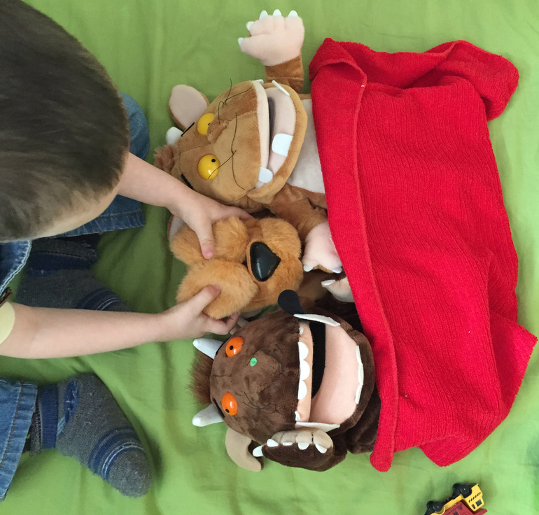Сегодня ребенок уложил спать свои игрушки и не разрешает мне ни феном голову посушить, ни пол пропылесосить: "Мама, не хуми! Бакука пииит!" (не шуми, Дочурка спит). Дочурка Груффало - любимая игрушка, хотя книжка так и не пошла...