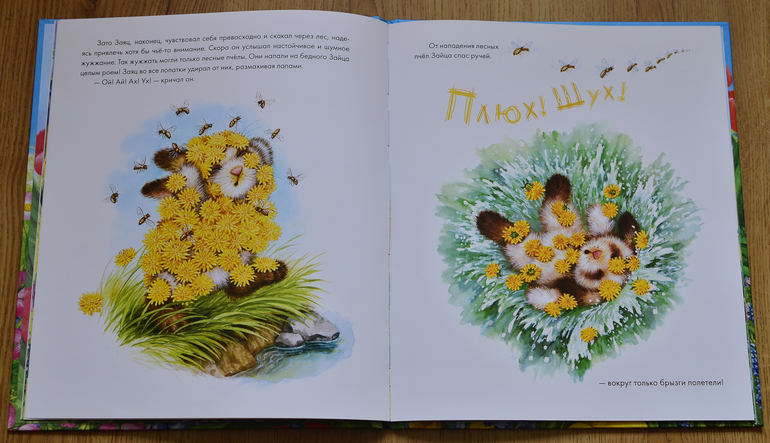 Справа на каждом развороте небольшой клапан, пока он закрыт, мы видим иллюстрацию к началу сказки, а открыв клапан - к ее окончанию, при этом часть изображения совпадает, и возникает как бы эффект анимации.
