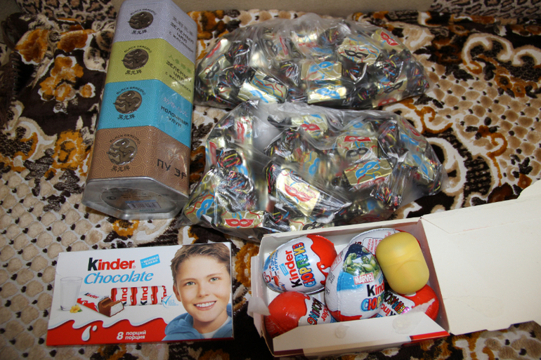 Вкусный чаек в красивеньких баночках, любимые конфеты мужа (огромное спасибо от него), Димины любимые киндеры! Столько сладкого, да еще с игрушками! Сколько было восторга!