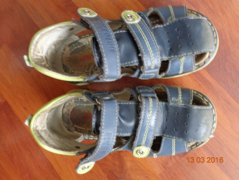1.Сандали из натур кожи. Реально износились ремешки и стельки(почернели),сбиты носы,но форму сандали не потеряли.Носились 1год.Размер 29.
