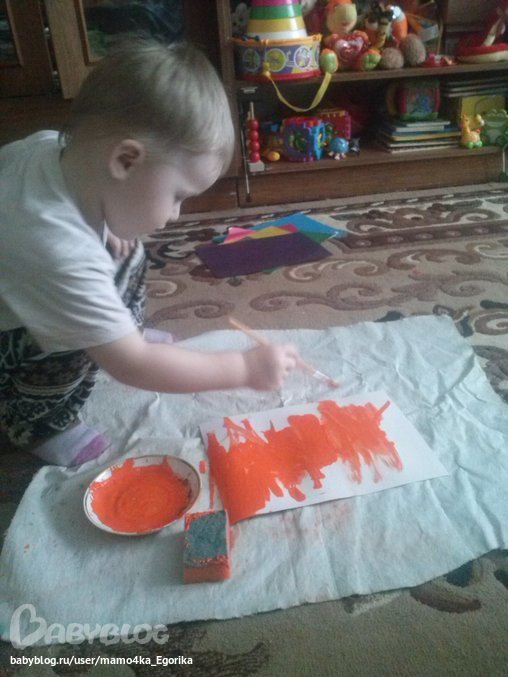 1.Сначала мы раскрасили альбомный лист оранжевой краской , т.к. дома не оказалось цветного картона .