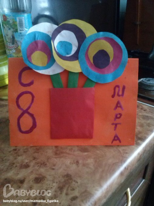 Начинаем потихоньку готовиться к 8 марта !!! Вчера сделали первую открытку для любимой тети . Идея взята