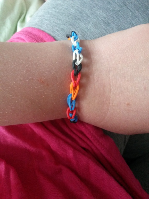 Старший сынок, находясь в лагере увлекся плетение браслетов из резиночек. Вот подарил мне первый браслет))Хоть и мелочь , а так приятно))