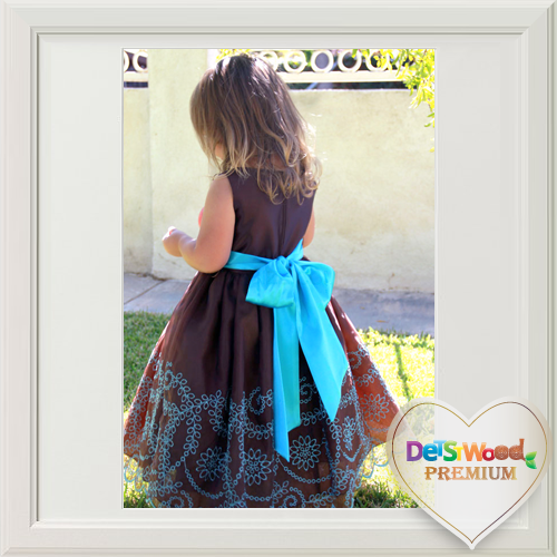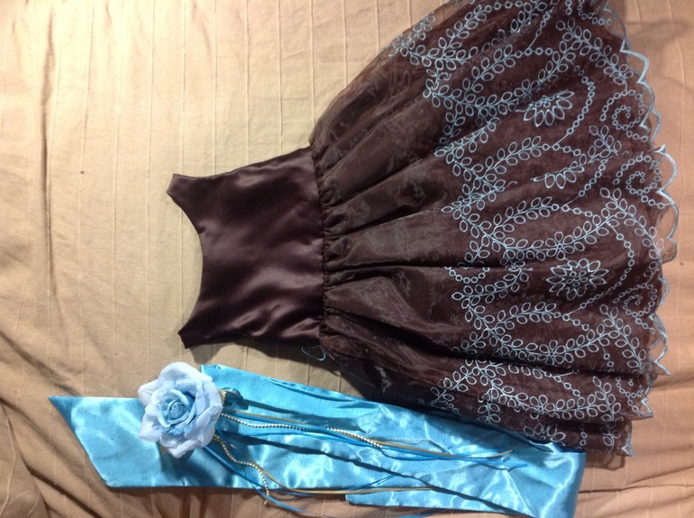 Роскошное атласное платье шоколадного оттенка с контрастной бирюзовой ажурной вышивкой по подолу, длинным шелковым поясом, украшенным розой-брошью