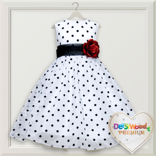Очаровательное платье в горошек, верхняя часть лифа полупрозрачное, украшено черным бантом с алой розой. Горошек на платье набит бархатом.