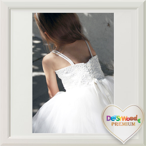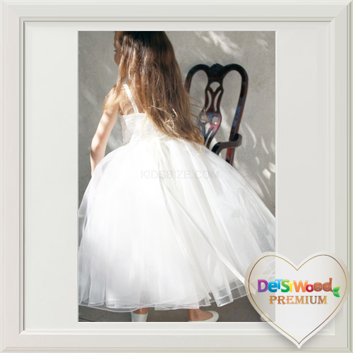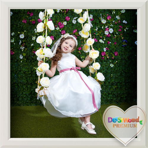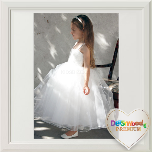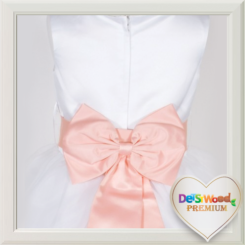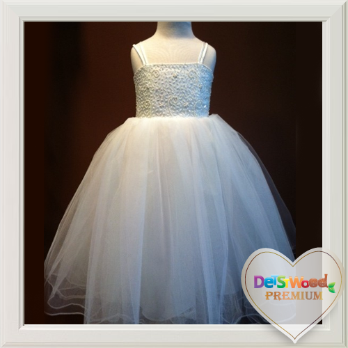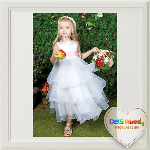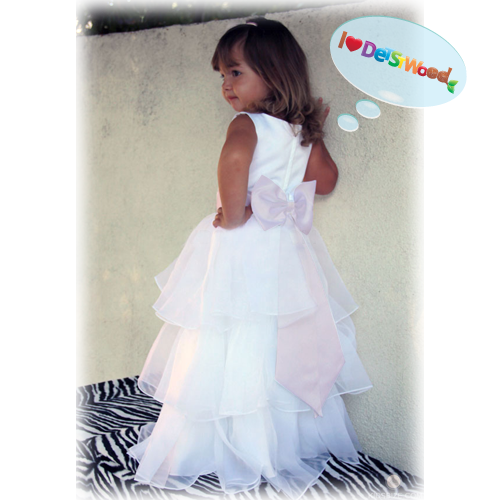 Нежное, многослойное белое платье в пол с атласным лифом и широким матовым поясом, свисающим до самого пола.Крой платья позволяет буквально за пару минут укоротить юбку, так, чтобы по мере роста малышки ее отпускать.