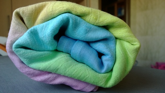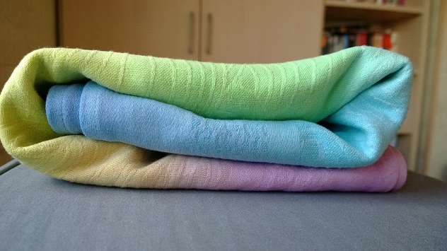 Очуменная нежно-радужная покраска Ксюши. Куплен новым специально для этого. Намотан всего пару раз, потому как одновременно и совершенно неожиданно появился другой радужный шарфик, который стал любимым. От покраски только выиграл, на мой взгляд цветоманиака :) очень высветился рисунок, который в некрашенном шарфе почти не виден. Покраска достаточно ровная, кое-где есть едва заметные огрехи, как то: неравномерный переход цвета, чуть светлее/темнее участки. Видно только при придирчивом осмотре. В намотке, естественно, не заметно вааще никак.