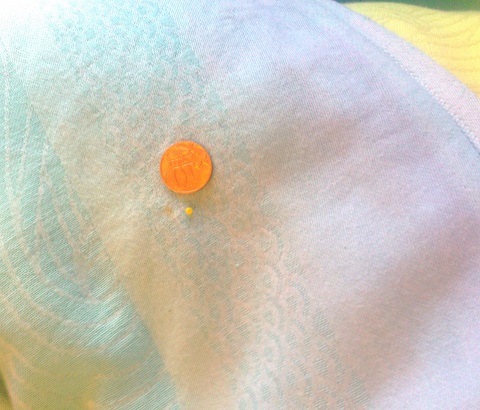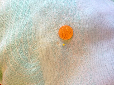Замеченный косяк: несколько пятнышек вдоль голубой полосы на расстоянии около 20 см. друг от друга. Фото самого заметного и крупного прикрепляю в сравнении с монеткой и бисеринкой. (фото с косяком высвечены, по другому на телефон не удалось снять, чтоб видно было)