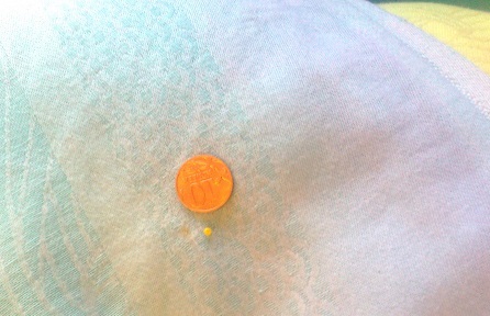 Замеченный косяк: 3-4 пятнышка, распределенные вдоль голубой полосы. Фото самого заметного и крупного в сравнении с монеткой и бисеринкой. (это фото высвечено, по другому не удалось снять, чтоб видно было)