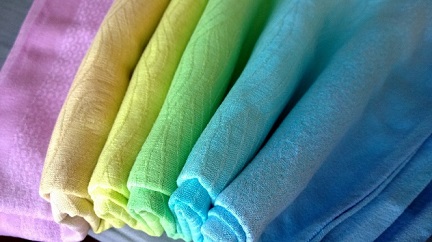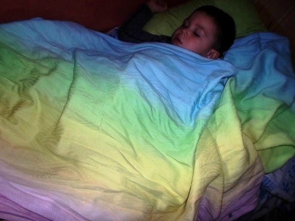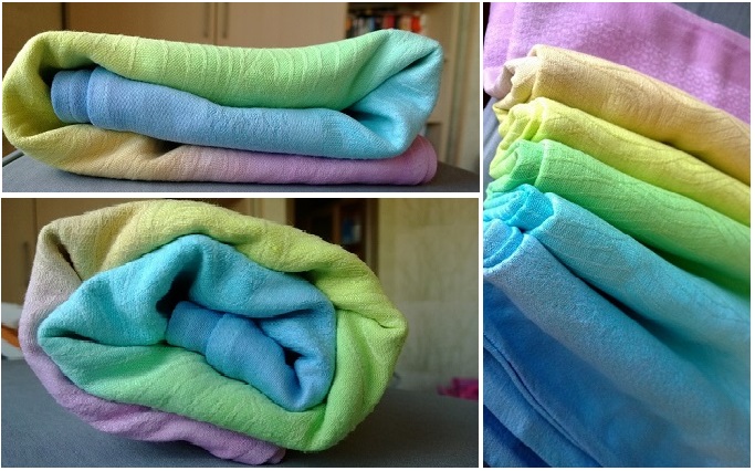 Куплен новым под покраску. Крашен пофи. Намотан два раза (один из них для фото), - неожиданно появилась другая радуга, которую и носили. От покраски сильно выиграл - стал виден рисунок, в натурном шарфе он почти не заметен. Покраска ровная, есть едва заметные огрехи: неравномерный переход цвета, чуть светлее/темнее участки. Видно только при придирчивом осмотре. В намотке не заметно.