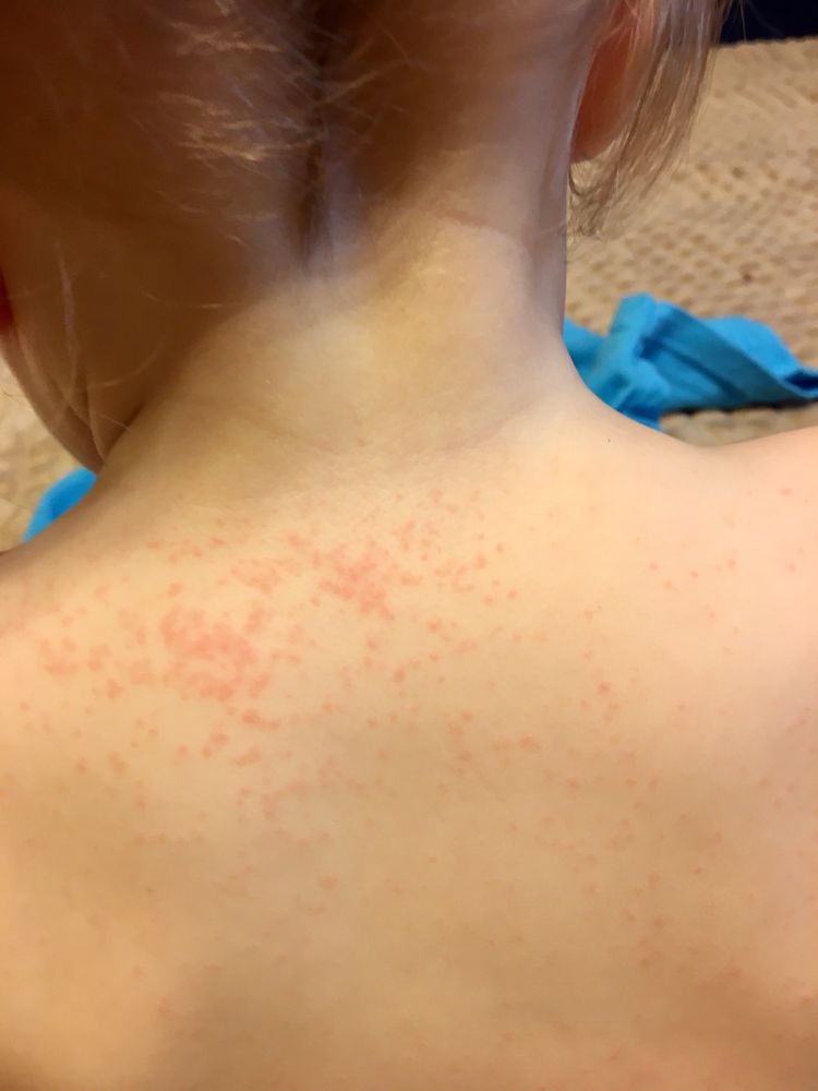 Ребёнку полтора годика. Аллергии пока выявлено не было. Вчера заметила сыпь на груди и верхней части спины. Ничего нового не ели и не делали. Была небольшая температура 37,2. Сегодня утром не было, но сыпи стало больше: по всей спине, груди, за ушами, в паху, к вечеру появилось ещё немного по рукам и на ладошках, только ноги чистые. Температура опять к вечеру была 37,2.