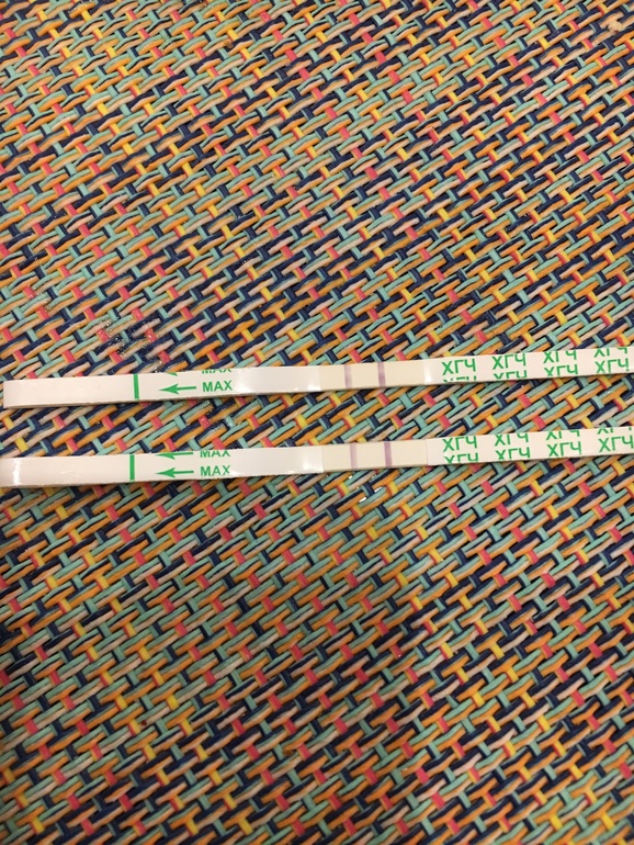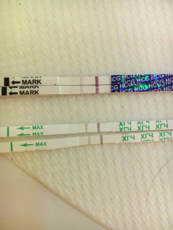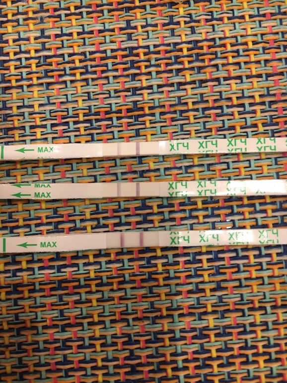 Ну и естесстно, опять бегу впереди паровоза, вчера купила вечером тесты, сделала один и сегодня с утра один и вечером в один стаканчик сразу два разных 🙈( нижние), последние сделаны через 50 часов после укола хгч 1500. Утром повторю.