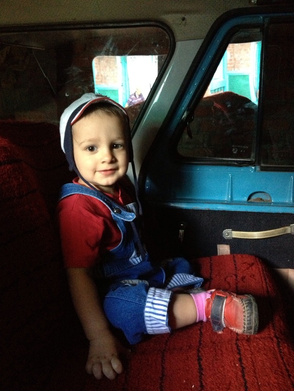 Еще там есть дедушкина машина - уазик. Очень нравится. :) Ездили пару раз, теперь проходя мимо гаража обязательно просится там посидеть. Гуляем пешком, без коляски, по деревне до магазинов и обратно и чуть-чуть во дворе. Там качели и так, просто всякое разное интересное и не очень. Даже на велосипеде садится покататься, но рулить и крутить педали пока не понимает как и зачем.