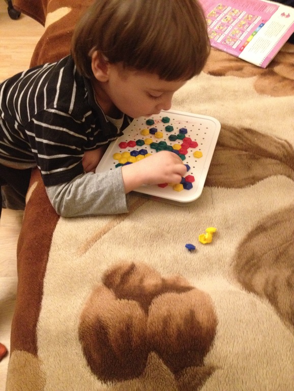 Что только не сделаешь ради мультика. :)) Прибрал игрушки за Гошиком и начал собрать крупную мозаику... но Гошик неутомим и полез помогать. Выделила Славе мелкую. Корпел, корпел... под конец уже разнервничался, положила перед ним карточку с мультиком и открылось второе дыхание. :))