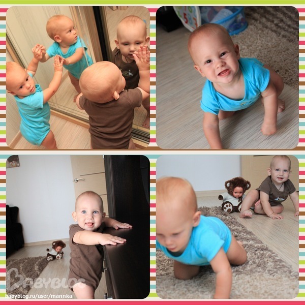 Сидит, ползает, ходит держась за опору, встает без поддержки. Очень активный мальчик! Копирует множество звуков. па-па-па, та-та-та, цоканье языком... тоже самое касается движений, мотает головой, когда кто-то рядом мотает, танцет в присядку, когда Артуся рядом отжигает, ладушки - это наше все!) Если ему что-то надо, он подползает к предмету и начинает хлопать в ладоши. Чаще всего это касается еды.