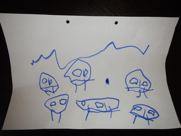 А эта очередная кучка инопланетян - это уже "расширенная семья" (комментировалось по-разному - то с бабушками, то с крестным или еще кем-то)))). Линия сверху - это "подпись" (комментировал, пока чертил "Эктор",по-видимому, копируя Филиппа, который пишет свое имя каждый раз, когда что-то нарисует).