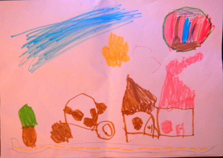 За последние недели, когда Эктор начал посещать предшколу (ходит туда все с большим удовольствием), у него произошел скачок в рисовании и в речи. В отличие от Филиппа, у которого огромные сложности в пересказе прошедших событий, Эктор довольно часто начал рассказывать, что они делали в школе и как (но тут другая сложность, что речь его пока очень невнятна, дикция смазанная, но прогресс и в этом есть, что радует). Сегодня они какой-то квадрат там рисовали, а также им рассказывали то ли про Луну, то ли про Землю (дословно перевожу - "Луна, на которой мы все живем" - вероятно, имелось ввиду "планета, на которой мы живем"). Также им там, вероятно, объясняют, что и как рисовать.