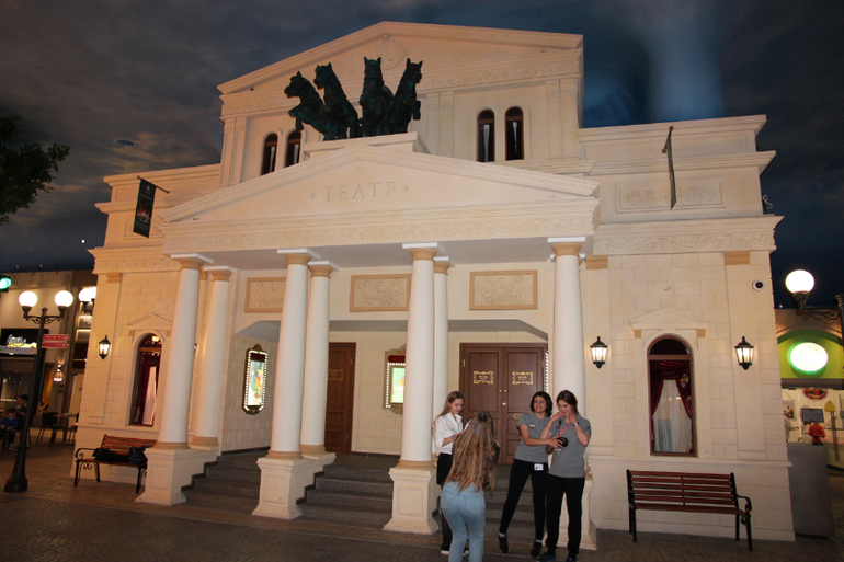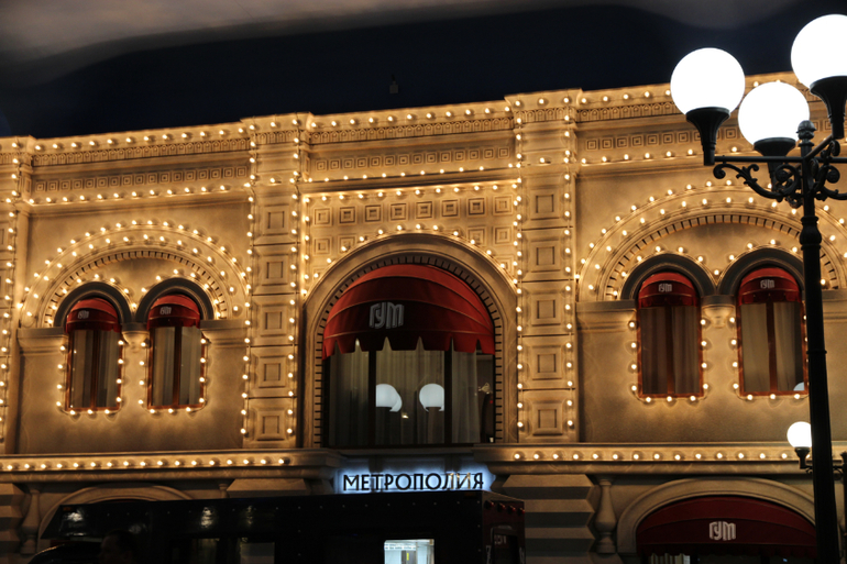 Макет Большого Театра, ГУМ, деревья, канализационные люки, брусчатка, кредитные карты, двухэтажный экскурсионный автобус, макет самолета в полный размер, промышленный альпинизм, парад жителей.