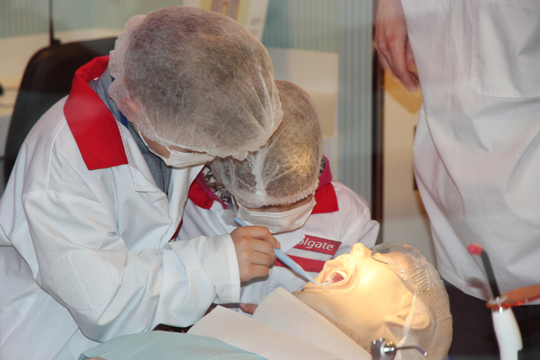 (Очень понравилось, что деткам видеокамерой проверили их зубы). Сначала они лечили зубы манекену, а потом посмотрели рот у них.