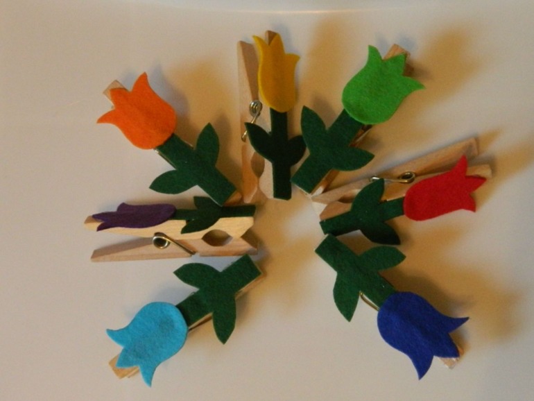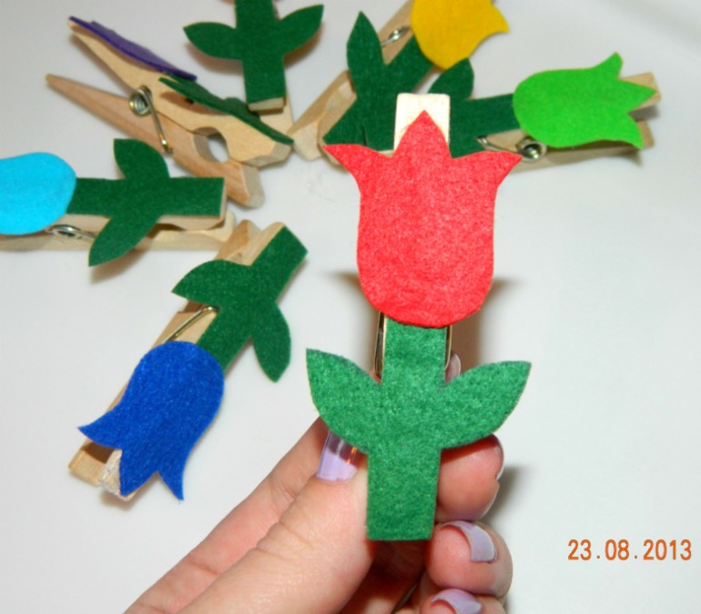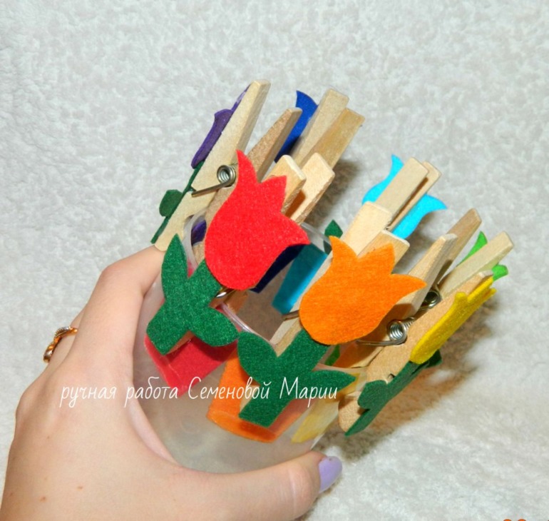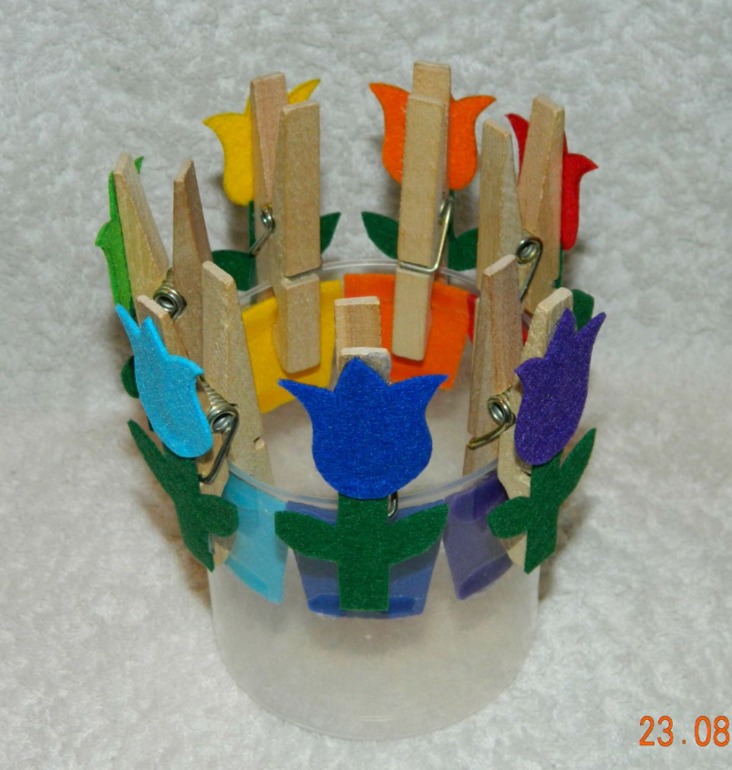 Ход работы: вырезать из фетра стебли с листочками, бутоны цветов и горшочки ( фото №1) - приклеить стебли с бутонами к прищепке, а горшочки на внутреннюю сторону контейнера (не забываем последовательность цветов радуги) - готово.