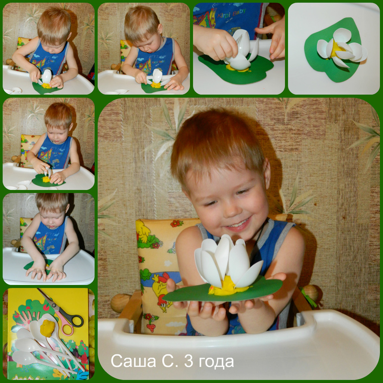 Ход работы: отрезаем от ложек держало - вырезаем из картона лист кувшинки (сердечки с закругленным углом) - разминаем пластилин к рукаш - приклеиваем его к центру листика - втыкаем черпало в пластилин - готово!