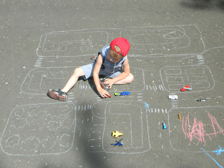 Так сегодня захотелось необычной игры на улице. Мы часто играем дома в "городок". Сегодня я была добрая и разрешила взять домашние игрушки. Санька выбрал несколько машинок, вертолкт, самолет. Эвелина схватила ведро с мелками и мы отправились на встречу новых эмоций.