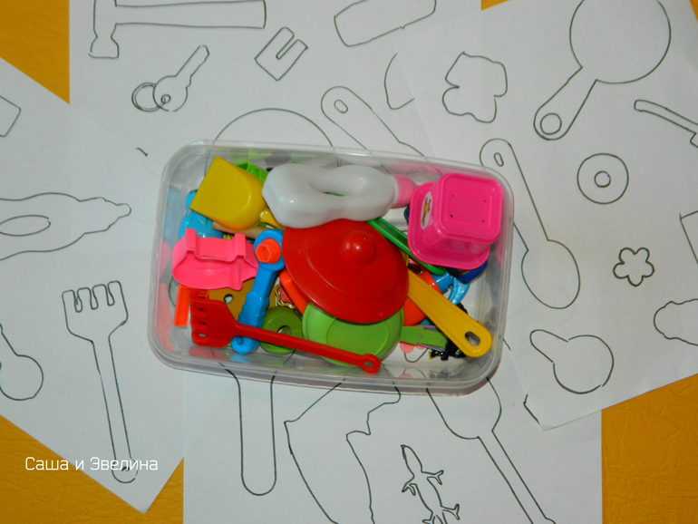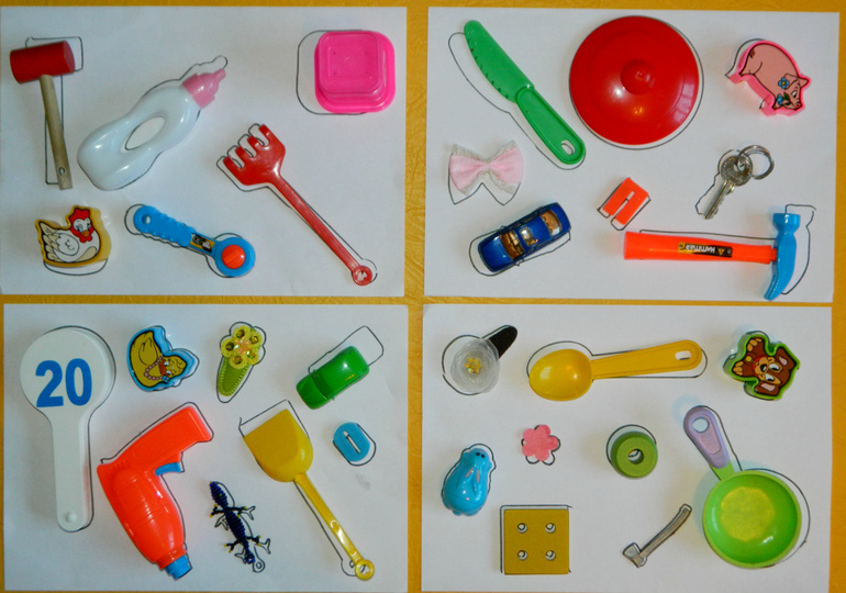 Игра: необходимо правильно разложить на лист все предметы по их трафаретам.