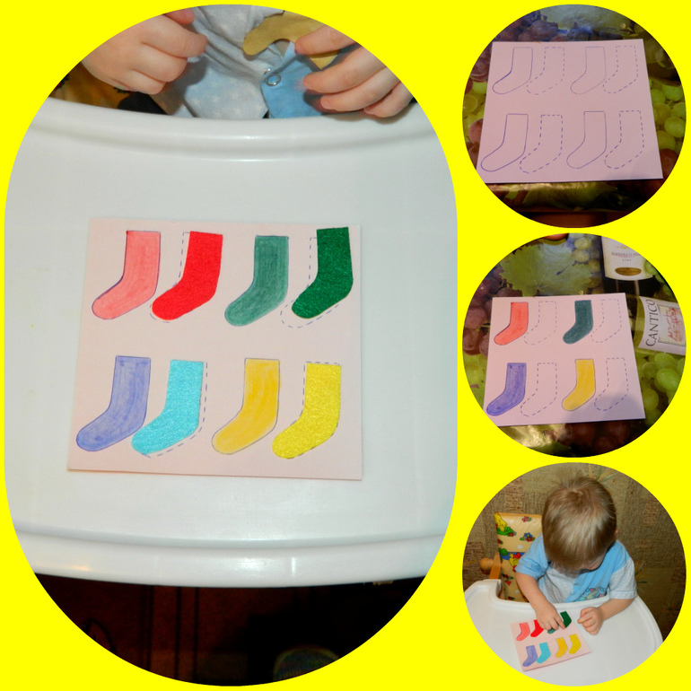 Ход работы: рисуем носочек - это наш трафарет - обводим этот носочек 8 раз на картоне - обводим и вырезаем носочек на фетр различного цвета - раскрашиваем по одному из каждой пары носочков на картоне - теперь можно приступить к занятию (необходимо приклеить насочек по трафарету к соответствующему по цвету носочку) - выполняем.