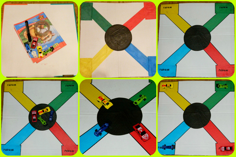 Ход работы: из цветной бумаги вырезаем заготовки для дороги и гаражей ( соответствующие цвету машинок), круглую парковку - приклеиваем все к к картону и подписываем - края картона обклеиваем скотчем - готово.