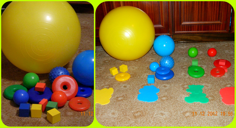 Ход игры: все складываем в одну кучу, перемешиваем и просим ребенка взять шарик желтого цвета (зеленого, синего, красного) и положить в определенное место. Так делаем до последней игрушки. Не всегда все будет получаться, особенно сначала. Расстраиваться не надо, чем чаще играть, тем быстрее ребенок начнет ориентироваться в цветах.