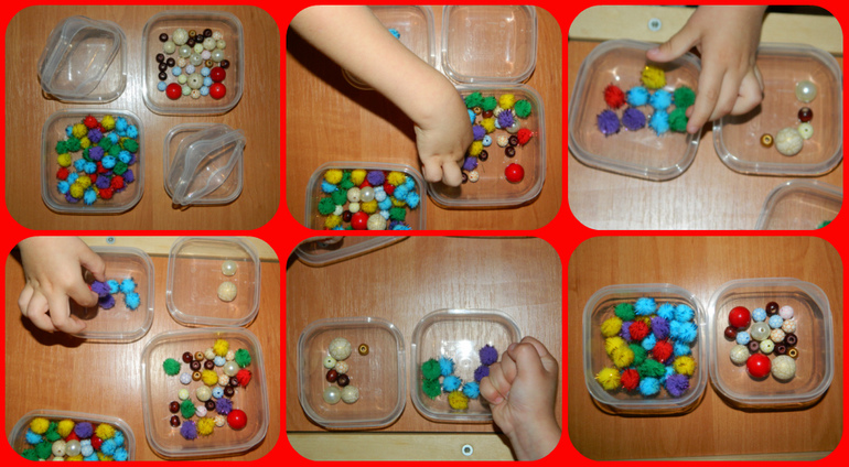Ход работы: из ниток делаем помпоны(или берем готовые) - в один контейнер помещаем шарики и помпоны - просим ребенка распределить по контейнерам твердые и мягкие предметы.