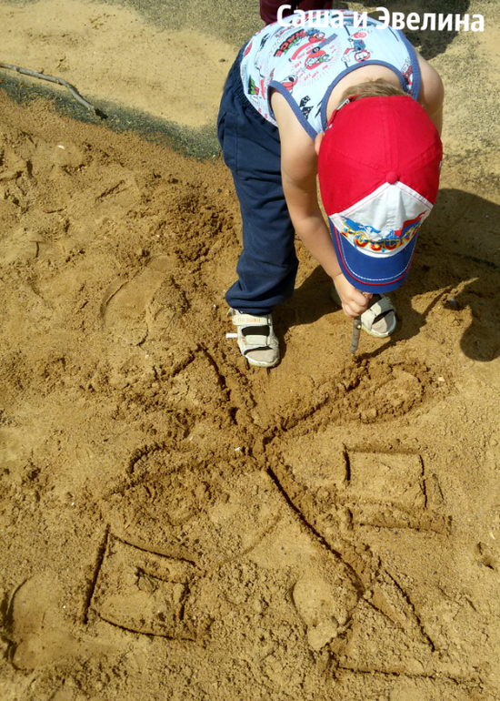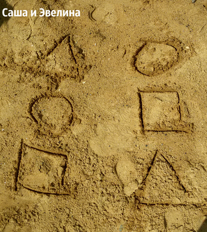 Случайно заметила, что Сантей взял палку и стал рисовать на песке, 2 треугольнико и соединил их линией. я быстро подхватила его идею и нарисовала на песке фигуры. Сантей все соединил. Теперь наши прогулки пополнились еще одной хорошей, развивающей игрой.